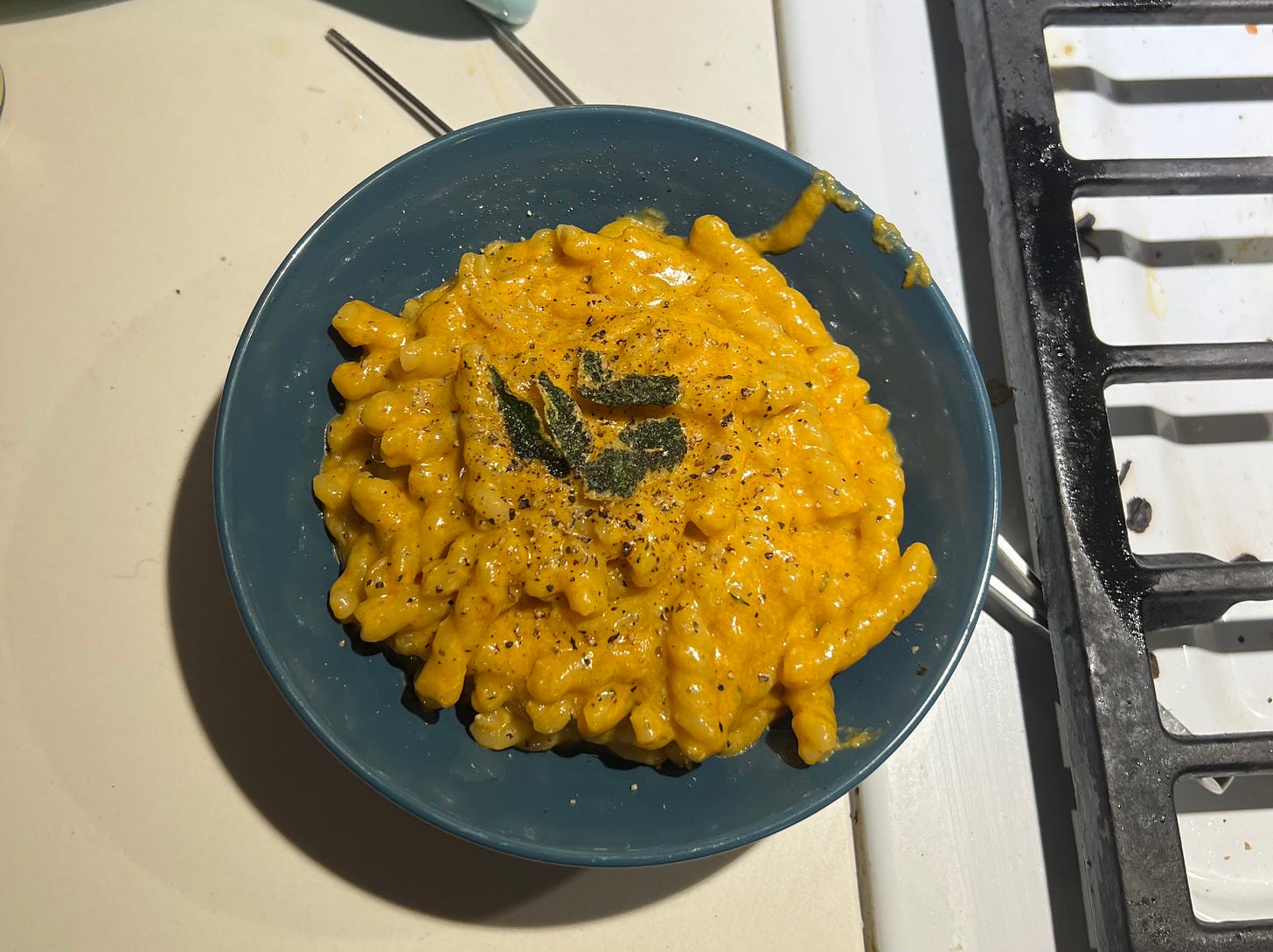 After making the pudding and the syrup, I had just enough pumpkin puree for one more recipe. I’m so glad it was this one. It’s deliciously cheesy and almost… smoky? It doesn’t really read ‘pumpkin’ — Katie said it tasted like pepperoni, though she admittedly hasn’t eaten pepperoni in 20 years — but the pumpkin adds a lot of depth (and again: fiber!). It also gave me the opportunity to try a pasta technique where you don’t actually drain the pasta water. I was skeptical! But it works.